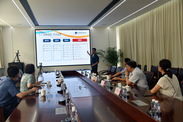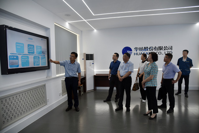 曹學軍一行先后參觀了花布車間、綜合辦公區(qū)、家紡展廳、研發(fā)創(chuàng)意中心、工程技術(shù)研究院、智云中心等部門和區(qū)域,并聽取了公司推進智能綠色工廠建設情況的匯報。