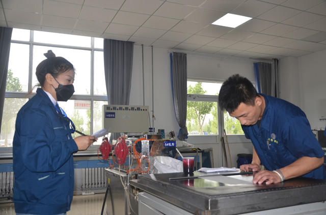 圖為4月26日公司對(duì)家紡車間化驗(yàn)室新員工進(jìn)行現(xiàn)場(chǎng)考評(píng)時(shí)的情形