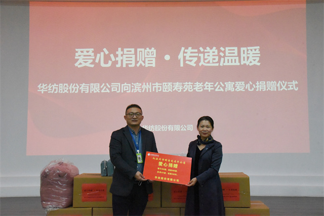 11月4日,公司舉行向?yàn)I州市頤壽苑老年公寓捐贈(zèng)愛心物資的活動(dòng)儀式。家紡分公司副總經(jīng)理曲偉華、濱州市頤壽苑老年公寓院長鄢桂珍等參加了捐贈(zèng)儀式。