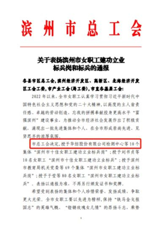 導讀:日前,公司檢測中心榮獲“濱州市十佳女職工建功立業(yè)標兵崗”榮譽稱號。