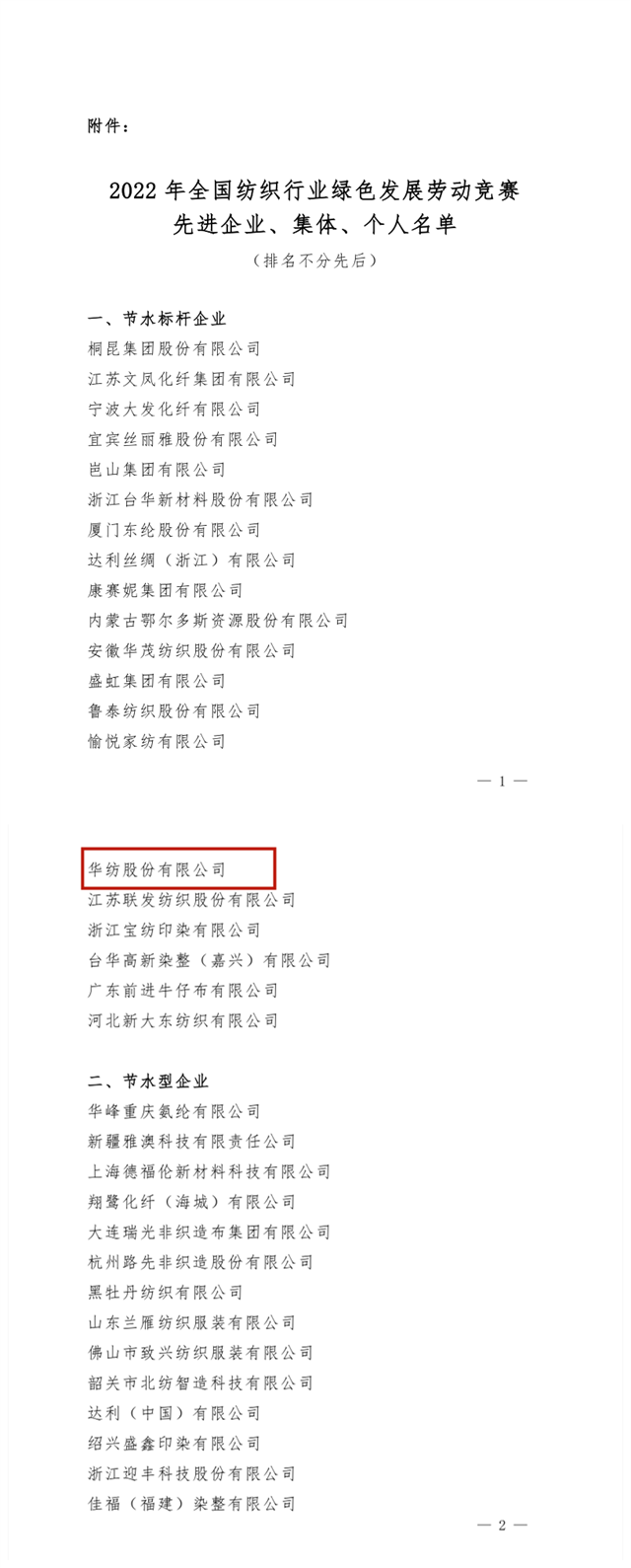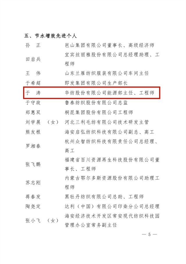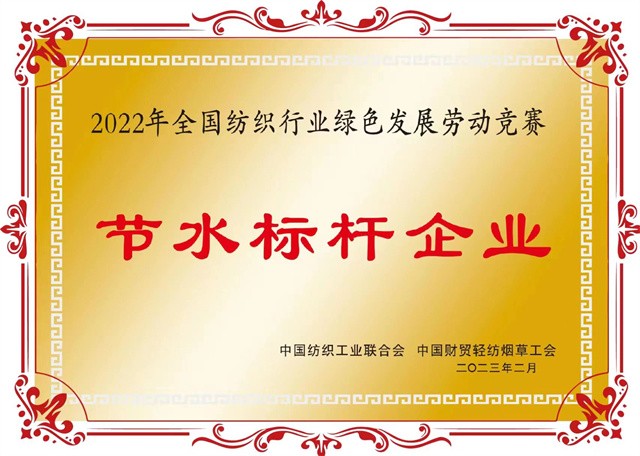 導讀:公司在全國紡織行業(yè)綠色發(fā)展勞動競賽中獲評“節(jié)水標桿企業(yè)”榮譽稱號、公司系統(tǒng)工程部能源副總工于濤榮獲“節(jié)水增效先進個人”榮譽稱號。