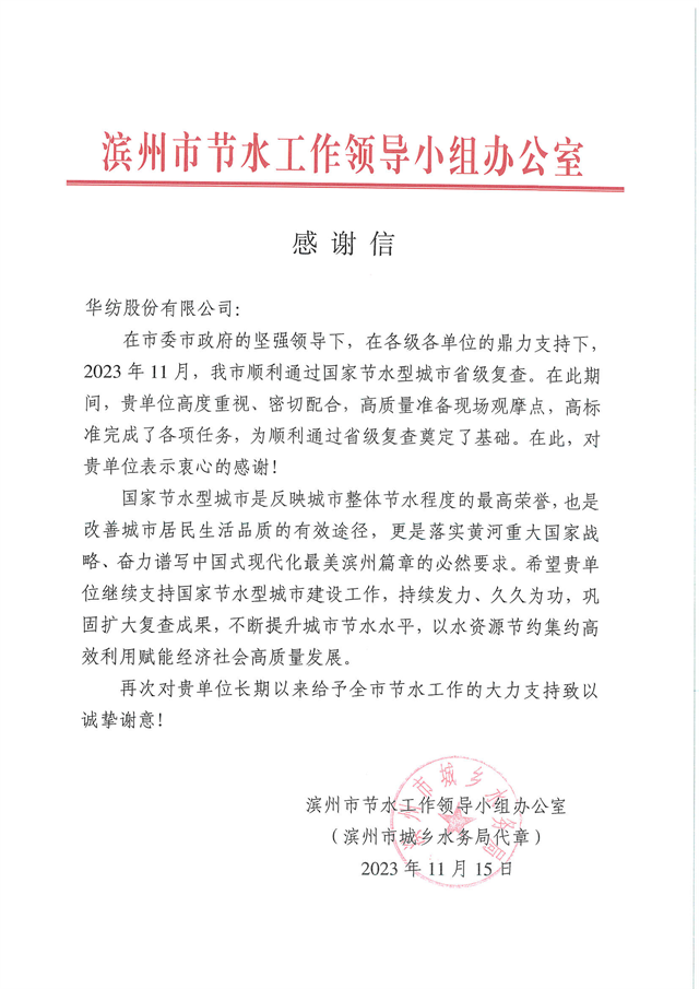 近日,濱州市節(jié)水工作領導小組辦公室向公司發(fā)來一封感謝信,信中指出:“2023 年11月,我市順利通過國家節(jié)水型城市省級復查。在此期間,貴單位高度重視、密切配合,高質(zhì)量準備現(xiàn)場觀摩點,高標準完成了各項任務,為順利通過省級復查奠定了基礎。”