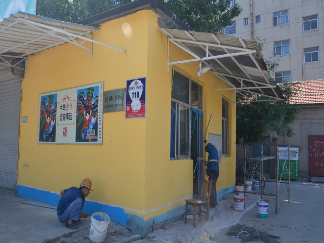 圖為公司志愿者粉刷經(jīng)編小區(qū)警衛(wèi)室、清理周邊環(huán)境衛(wèi)生等情形。