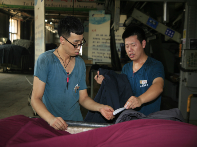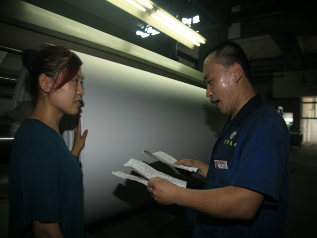 面三車間陳萬龍(圖右)在與本車間后處理預(yù)縮機(jī)機(jī)長(zhǎng)王巖軍核對(duì)完試驗(yàn)布數(shù)據(jù)后,說:“氣溫高,我們的勞動(dòng)熱情更高!”