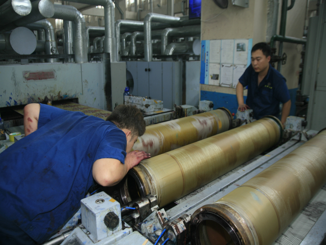 花一車間后處理技術(shù)員張延軍(圖右)與軋光機(jī)機(jī)長(zhǎng)吳秀祝在交流生產(chǎn)情況。他倆表示,每一米優(yōu)質(zhì)產(chǎn)品都是靠專注認(rèn)真干出來的。