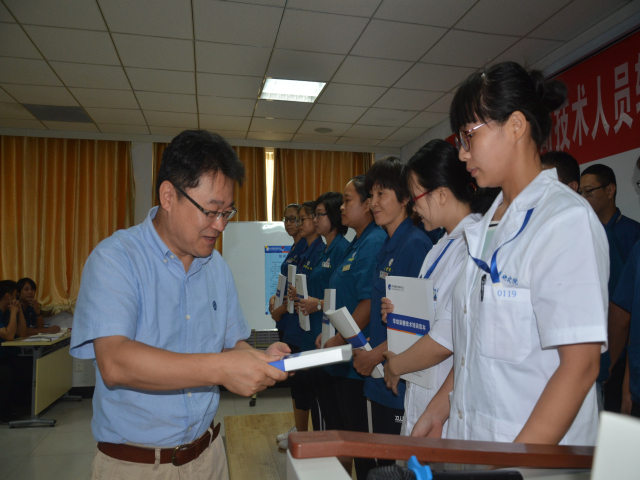 儀式在記錄輪訓(xùn)班發(fā)展歷程的專題片《我們從這里出發(fā)》中開始,孫紅玉做了題目為《服務(wù)新動能 筑夢新時代》的總結(jié)報告,從公司整體培訓(xùn)數(shù)據(jù)、六期培訓(xùn)情況及數(shù)據(jù)、輪訓(xùn)必要性,六期結(jié)業(yè)標準等幾個方面做了詳細報告??偣こ處熈_維新宣讀了公司對培訓(xùn)班(第六期)郭紅娥等19人準予結(jié)業(yè)的通報,對培訓(xùn)班(第六期)優(yōu)秀小組、優(yōu)秀學(xué)員的表彰決定,對培訓(xùn)班(第七期)學(xué)員組成的通報。副總經(jīng)理孫中然為結(jié)業(yè)的19名學(xué)員頒發(fā)了結(jié)業(yè)證書和紀念品,并且為評選出來的優(yōu)秀小組花二車間小組和優(yōu)秀學(xué)員郭紅娥、趙山松、譚雪梅頒發(fā)了獎狀和榮譽證書。工程技術(shù)研究院院長毛志平為第七期學(xué)員授書。第五期學(xué)員代表李冬冬,第六期優(yōu)秀學(xué)員代表郭紅娥,第七期學(xué)員代表郭萍萍分別做了分享發(fā)言。